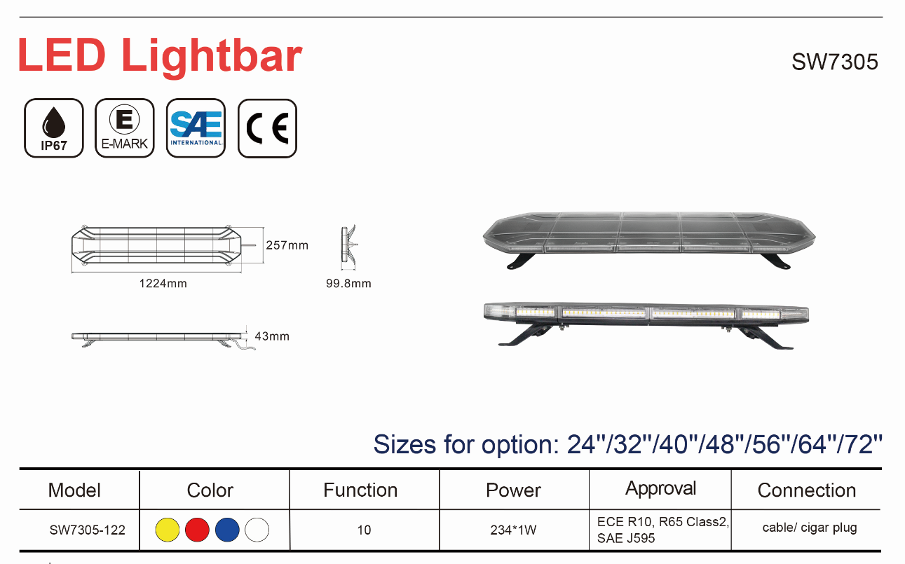 LED Warning Lightbar, low MOQ, ECE R65, R10, SAE Approval, economical type, ranges from 24'' to 72''